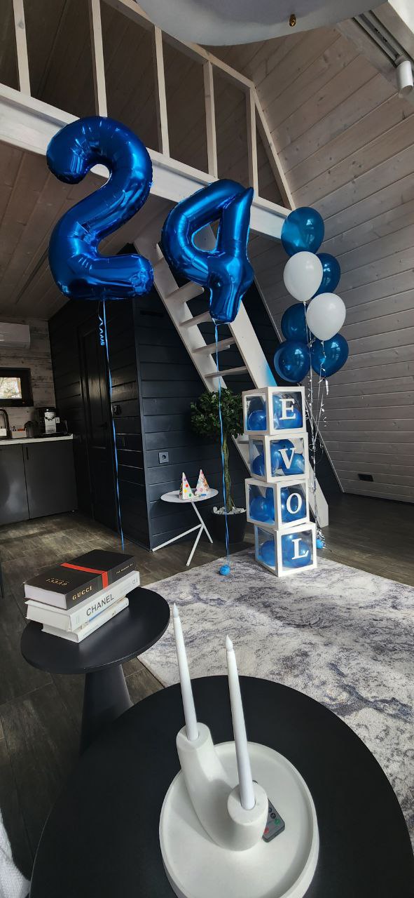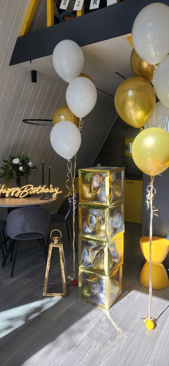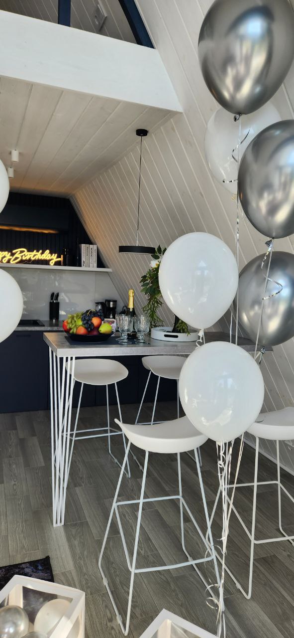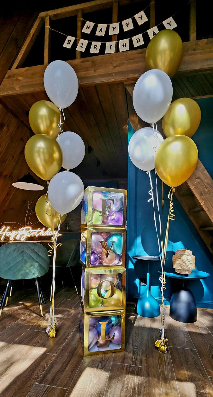 украшаем помещение композицией из латексных гелевых шаров (15 шт) диаметром 30см;
