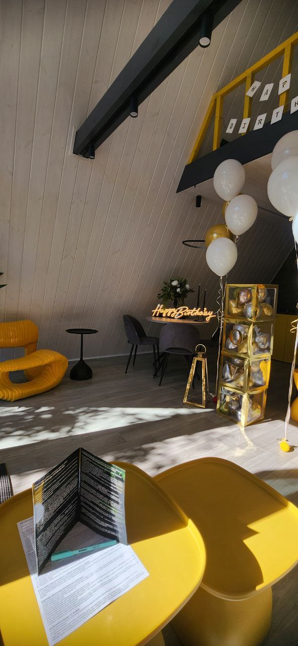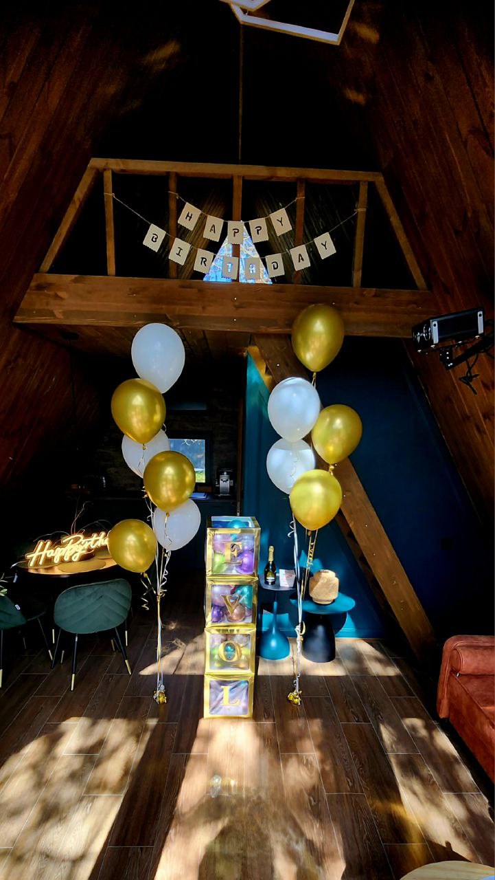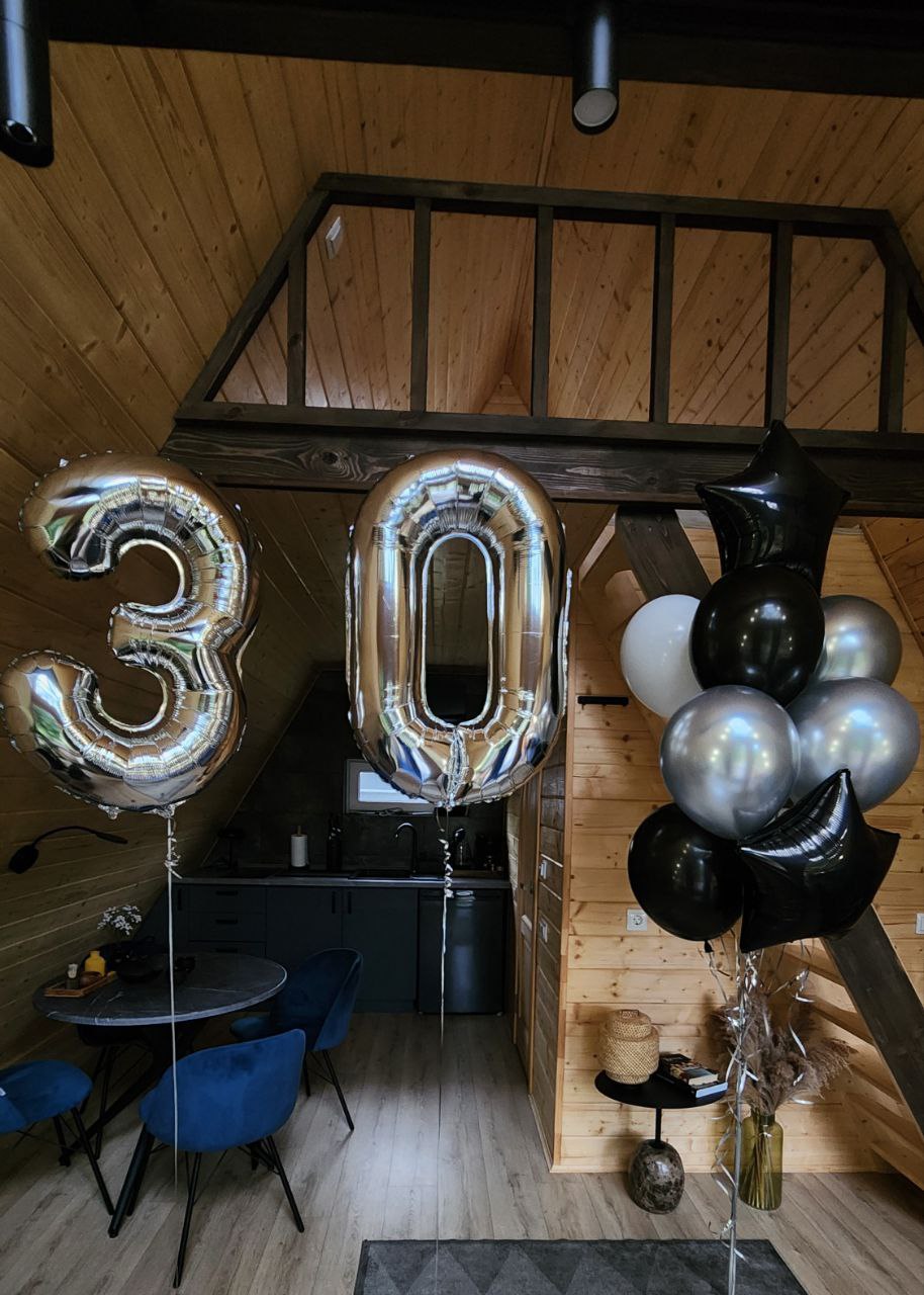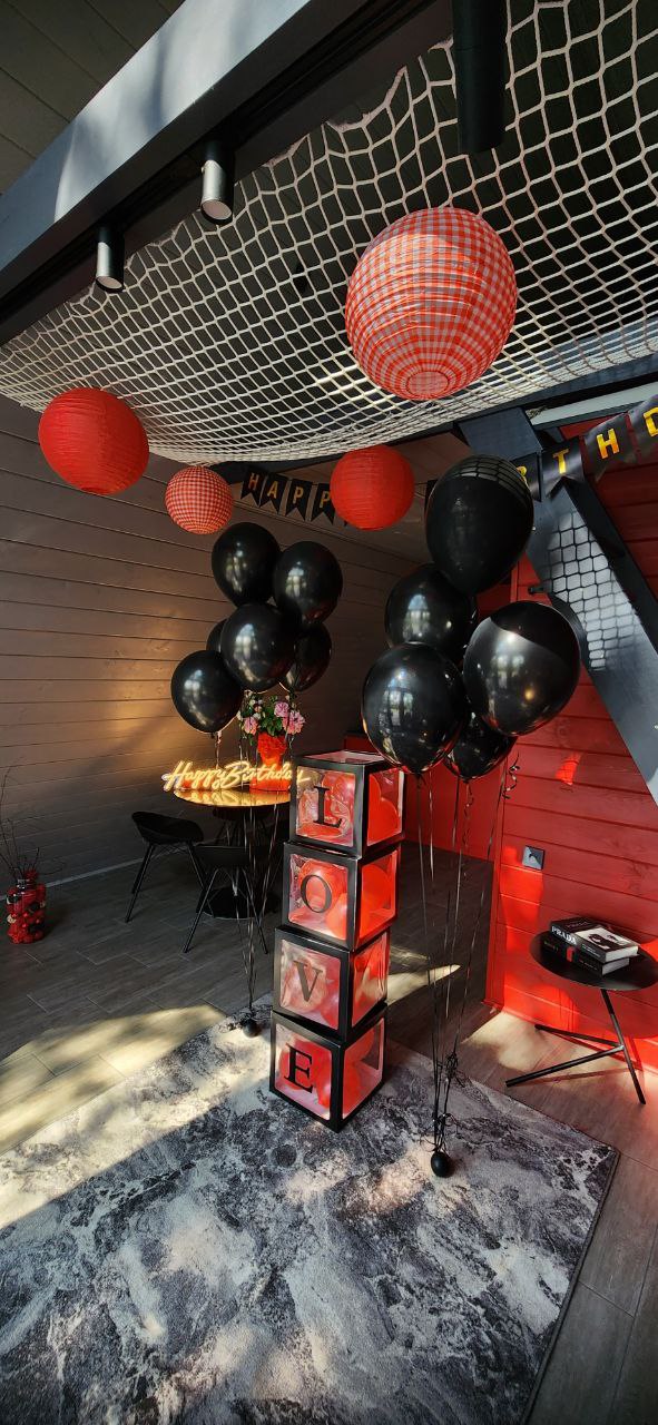 украшаем помещение композицией из латексных гелевых шаров (15 шт) диаметром 30см;