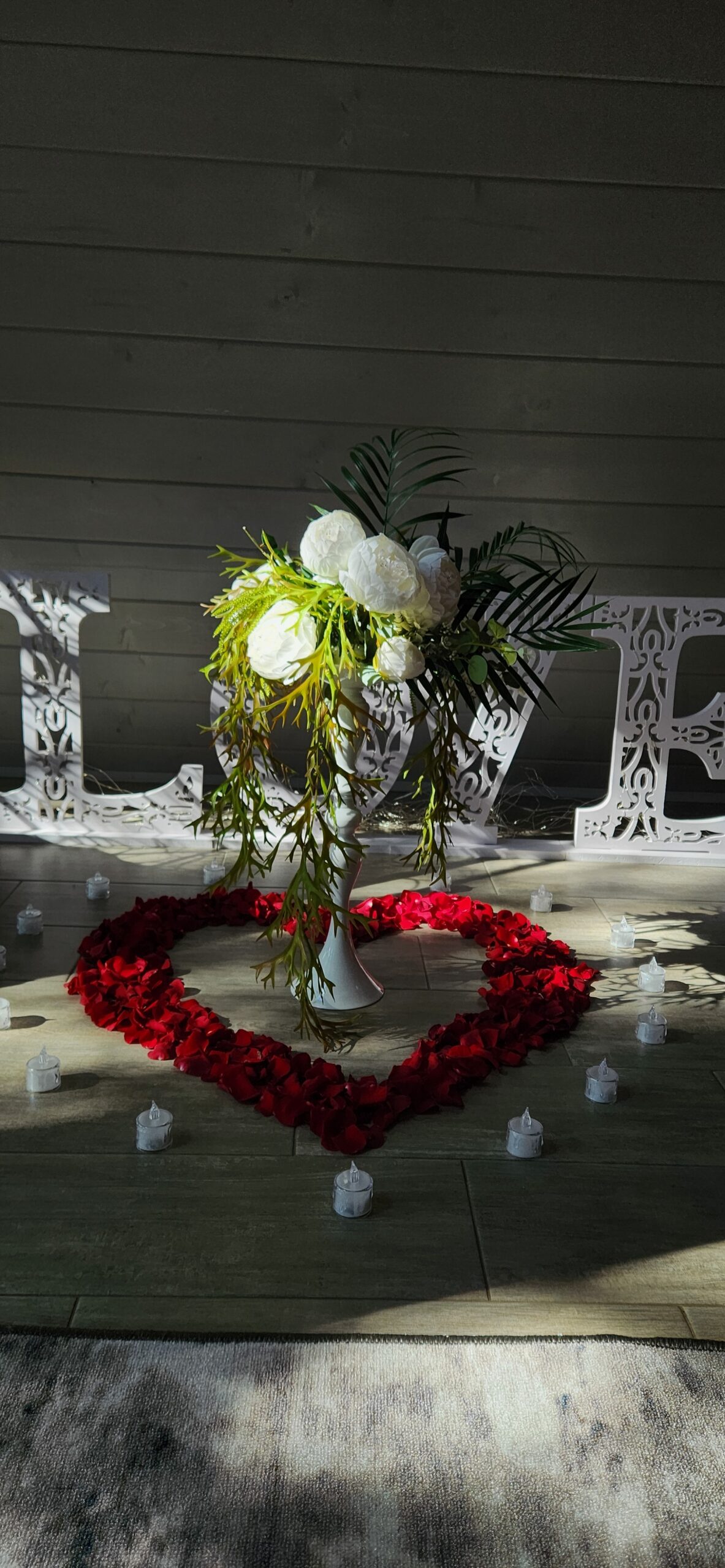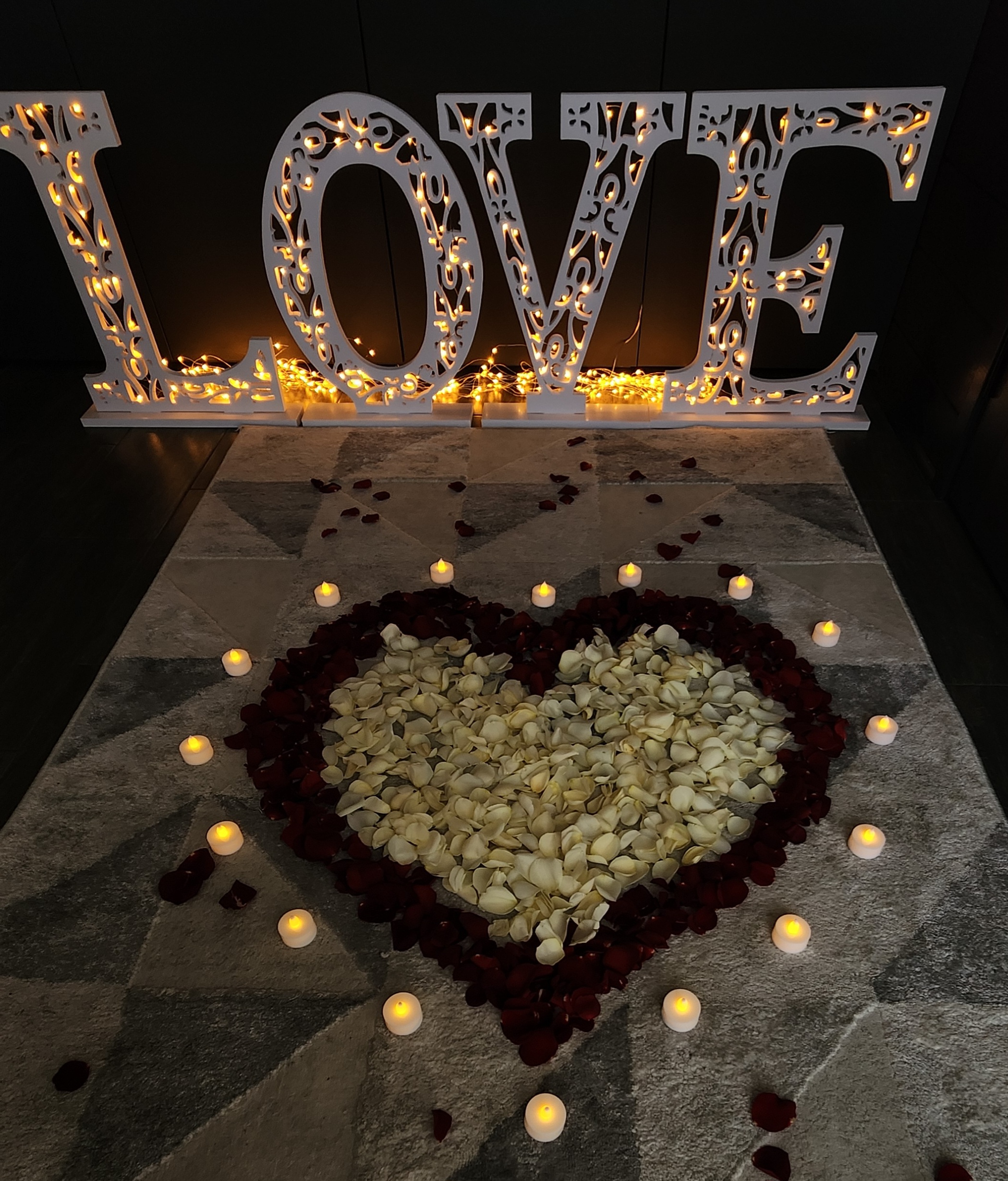 - украшаем дом лепестками живых роз, выкладываем большое сердце из лепестков роз 1 цвета*500шт ( красное, розовое или белое — в зависимости от сезона )