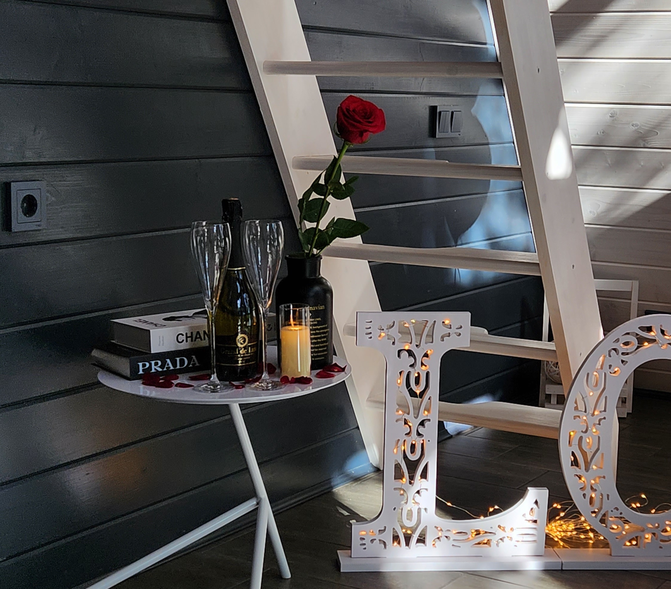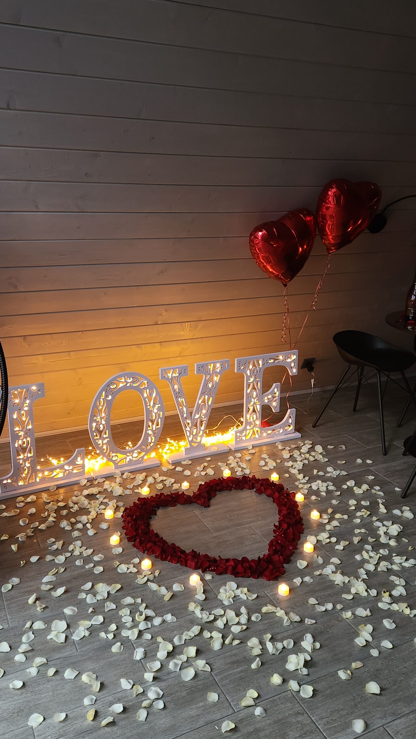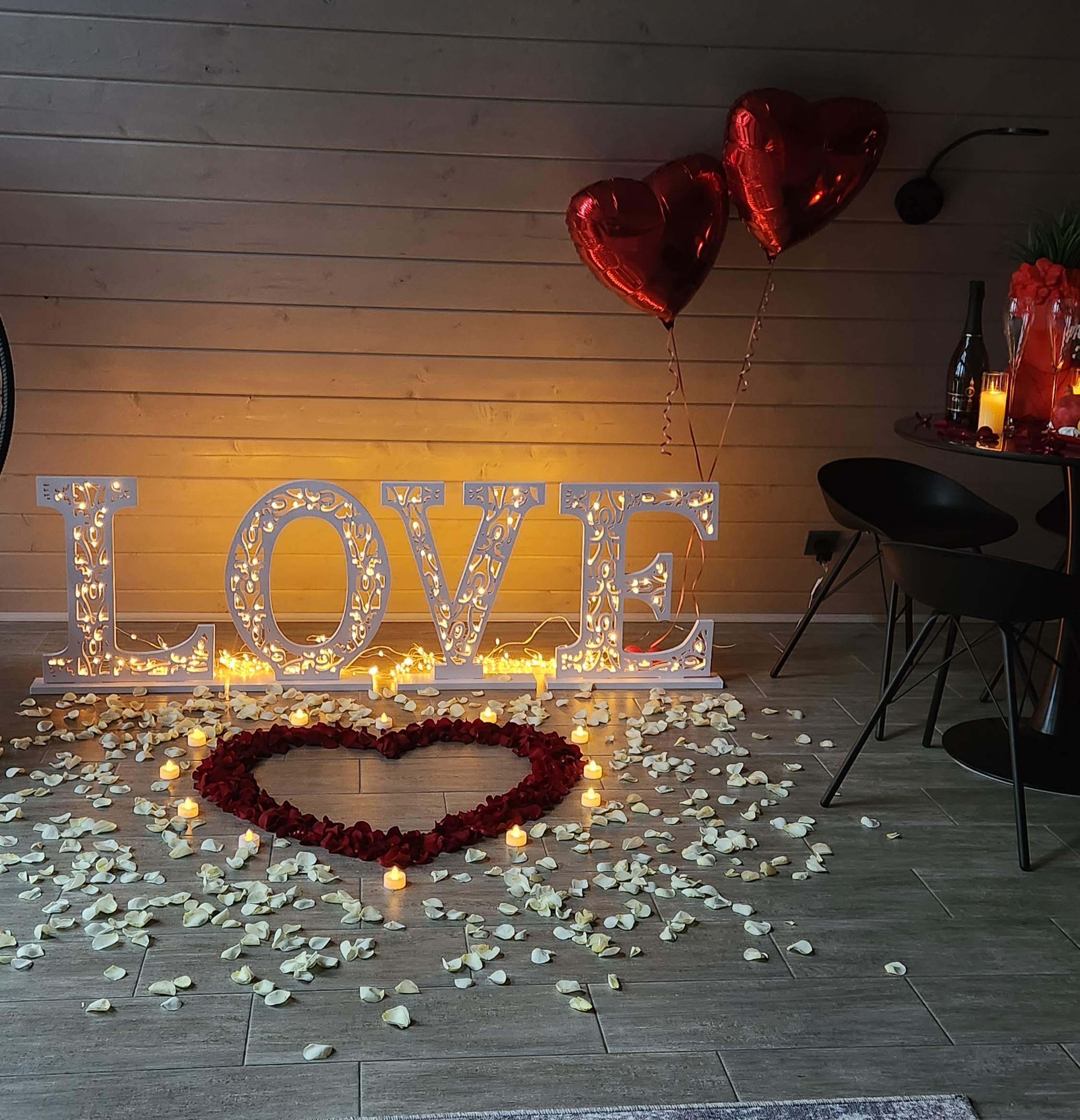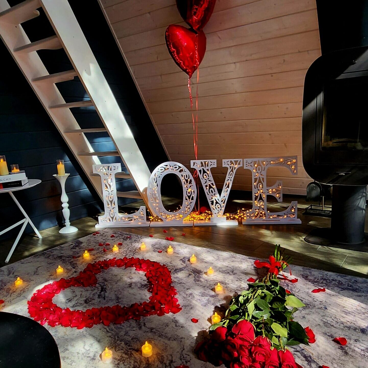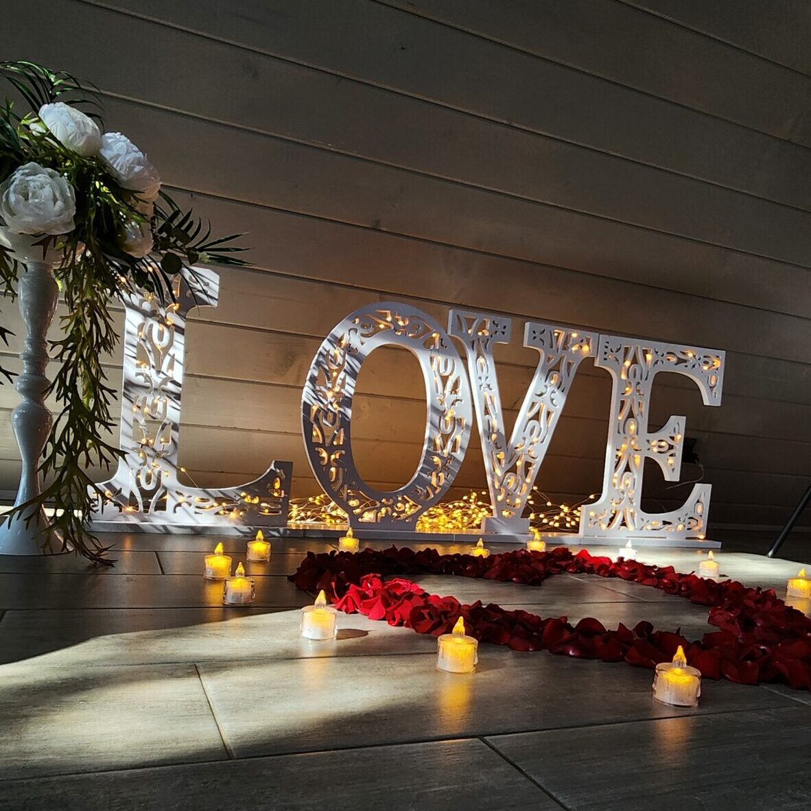 - в доме размещается светящийся декор из ажурных букв LOVE (большие).